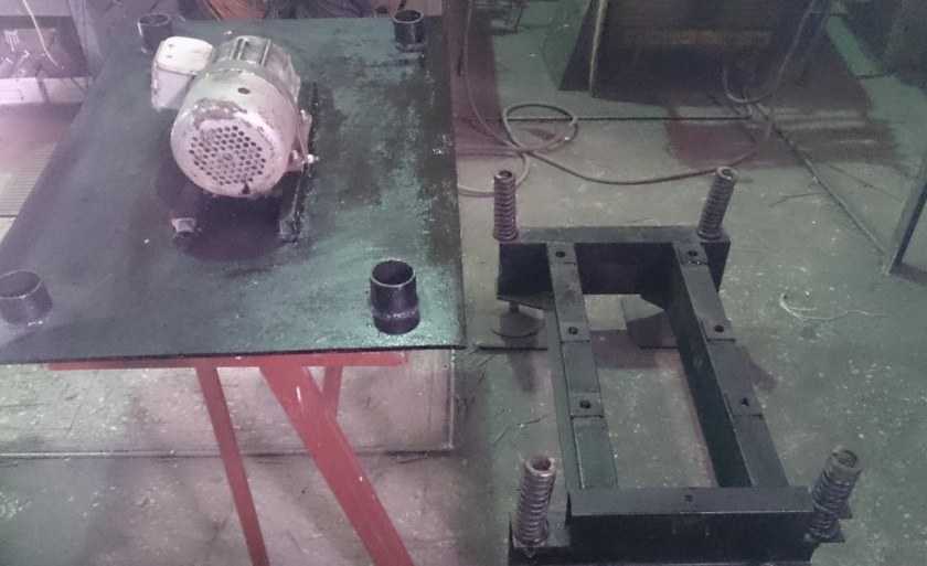 Если планируется изготавливать горизонтальный вибропресс, между опорной конструкцией и подвижной столешницей располагают рессоры. В случае с вертикальным вибростолом верхняя его часть, где устанавливаются формы с цементным раствором, имеет длинные ножки, которые соединяются с подвесами, зафиксированными на основании. Для упрочнения предусматриваются ребра жесткости. Такая мера является необходимой при использовании двигателя существенной мощности для обеспечения работы крупногабаритной конструкции.