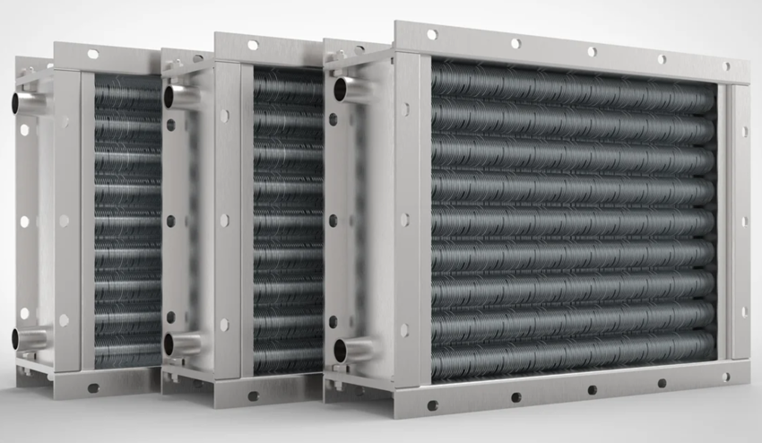 Трубки установлены в плоскую прямоугольную раму в 2, 3 или 4 ряда. Расстояние между осями трубок способствует максимальной теплоотдаче от их поверхности. Подача воздушного потока производится при помощи осевого или радиального вентилятора, это зависит от места установки прибора и специфики его работы.