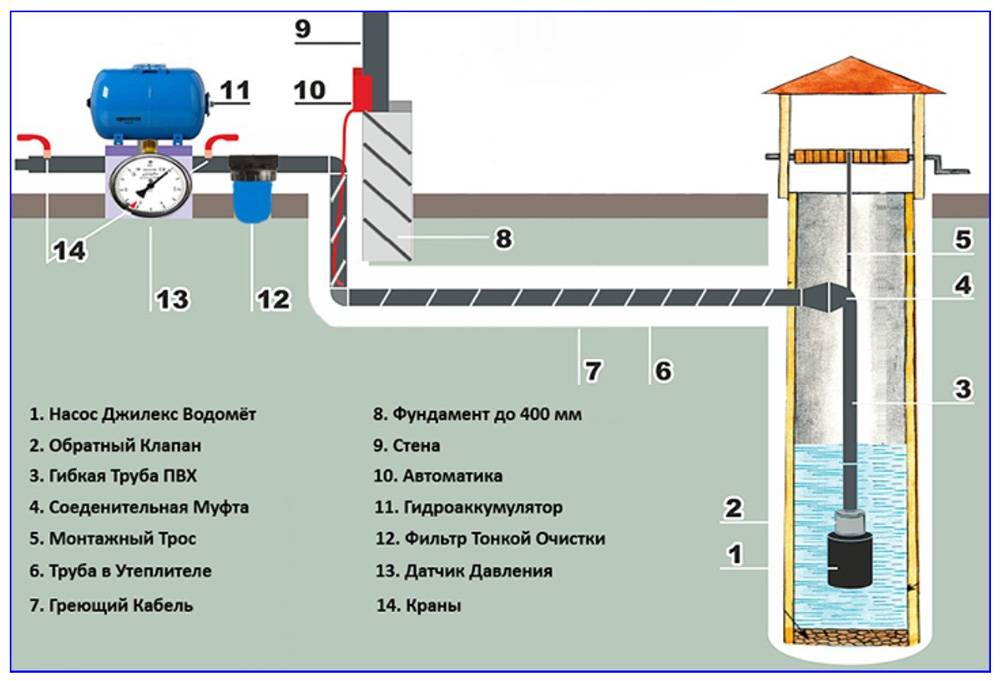 Функциональные детали колодезного водоснабжения идентичны комплектующим других разновидностей локальных систем и представлены следующими элементами: