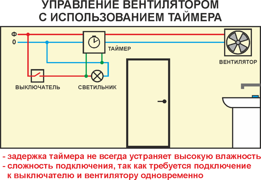 Зачастую связан с общим освещением комнаты, то есть когда кто-то входит в санузел, то происходит одновременное включение света и вентилятора.