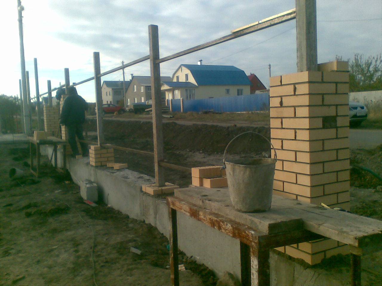 В подготовленную опалубку заливается бетон с предварительным армированием. Это делается обязательно, поскольку вся конструкция будет иметь значительный удельный вес. Кирпичный столб обычно выкладывается площадью 1,5х1,5 кирпича. Это — самый оптимальный вариант. Кирпичи укладываются со сдвигом на растворе обычного состава.