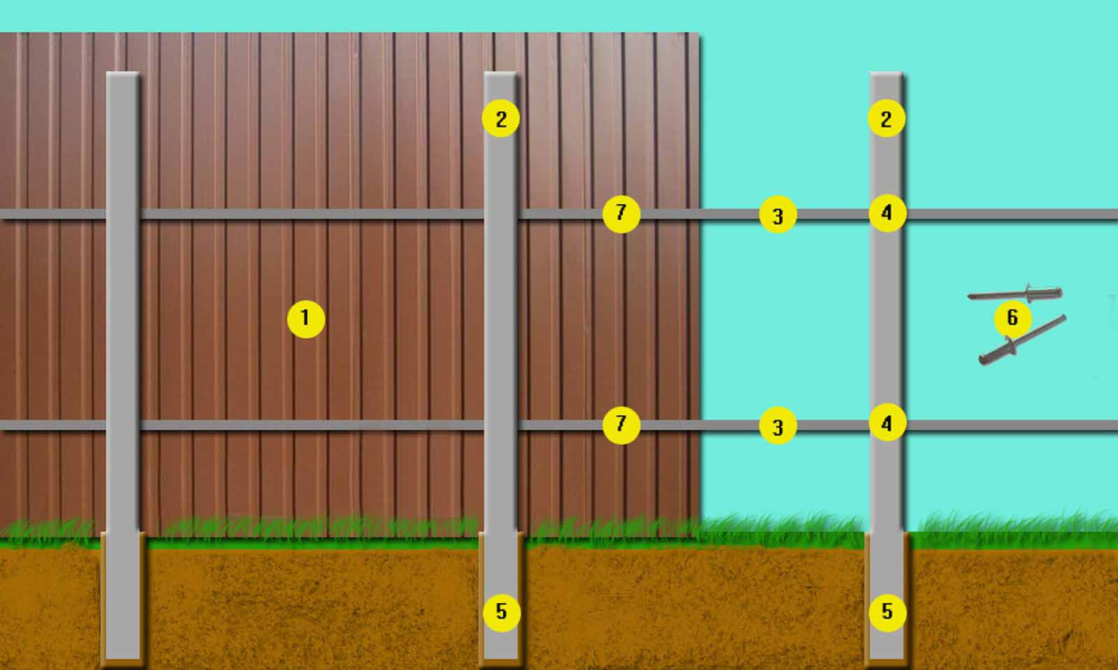 Когда бетон высохнет, на опорные столбы крепят поперечные лаги. Это делается посредством, болтового соединения, дюбелей или сварки. Поверх лаг крепятся листы профнастила. Лучше всего для этого использовать кровельные саморезы для металлических материалов. Забор из профнастила своими руками со столбиками, изготовленными из металла, можно обшить профлистами, как с одной, так и с двух сторон. Во втором случае прочность и надежность ограждения значительно выше, несмотря на сравнительно небольшое удорожание конструкции.