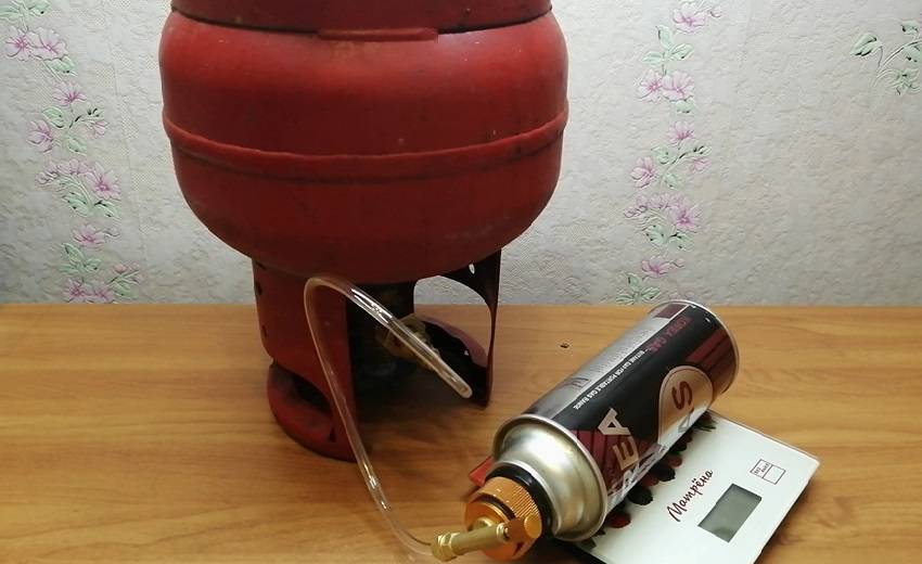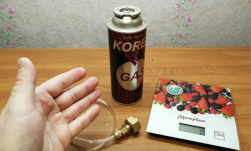 Первый этап – работа с весами. Нужно взвесить пустые баллончики. Это необходимо для определения точного количества залитого газа в самом конце. Затем с помощью переходника соединяется пустой баллон с бытовым.