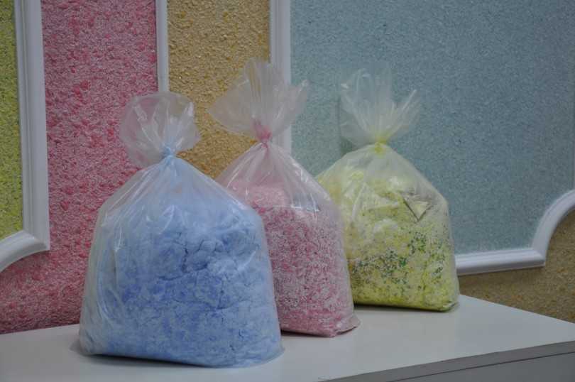 Обои могут быть в пластиковых вёдрах (полностью готовые), сухие с добавлением текстуры и красителей либо сухие, но без добавления нужных элементов. Указанные производителем площади покрытия рассчитываются на поверхность идеальной ровности в слой не более 1,5 мм, поэтому материал стоит приобретать с запасом.